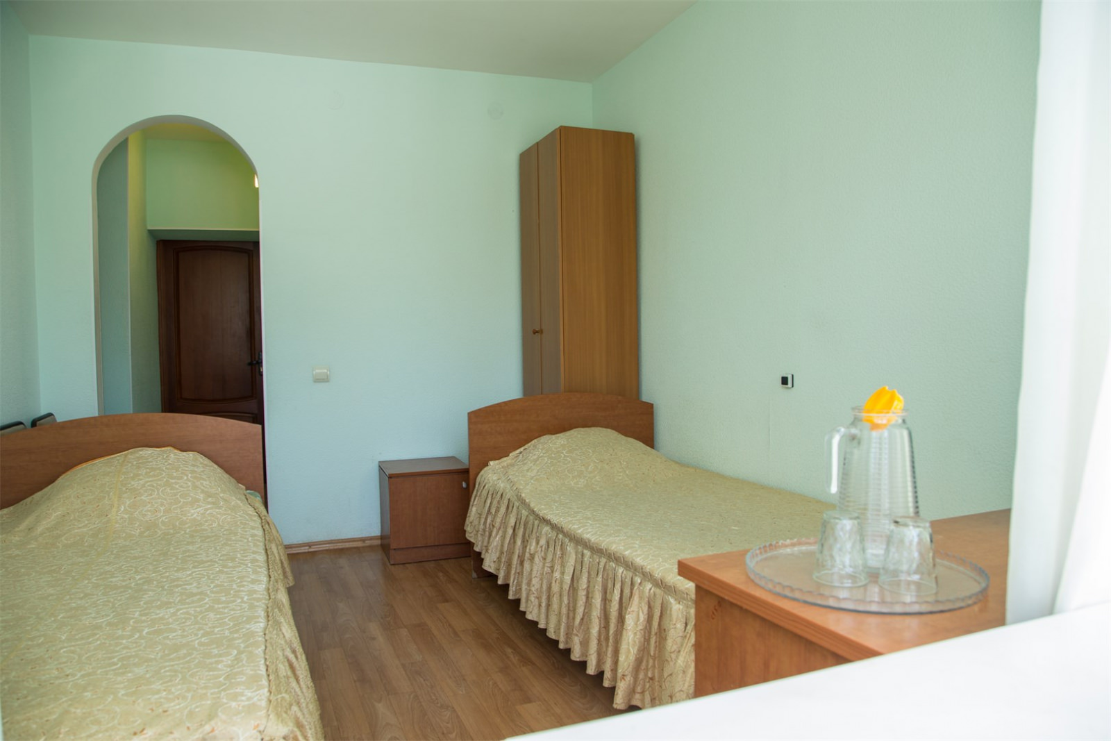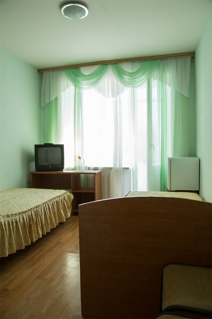 Площадь номера - 16-20 кв.м. 2 осн. места. Мебель: кровати односпальные, тумба под телевизор. Оборудование: мини-холодильник, телевизор. Санузел: с ванной, туалетные принадлежности. Сервис: Wi-Fi бесплатно, смена полотенец, смена постельного белья, уборка номера.