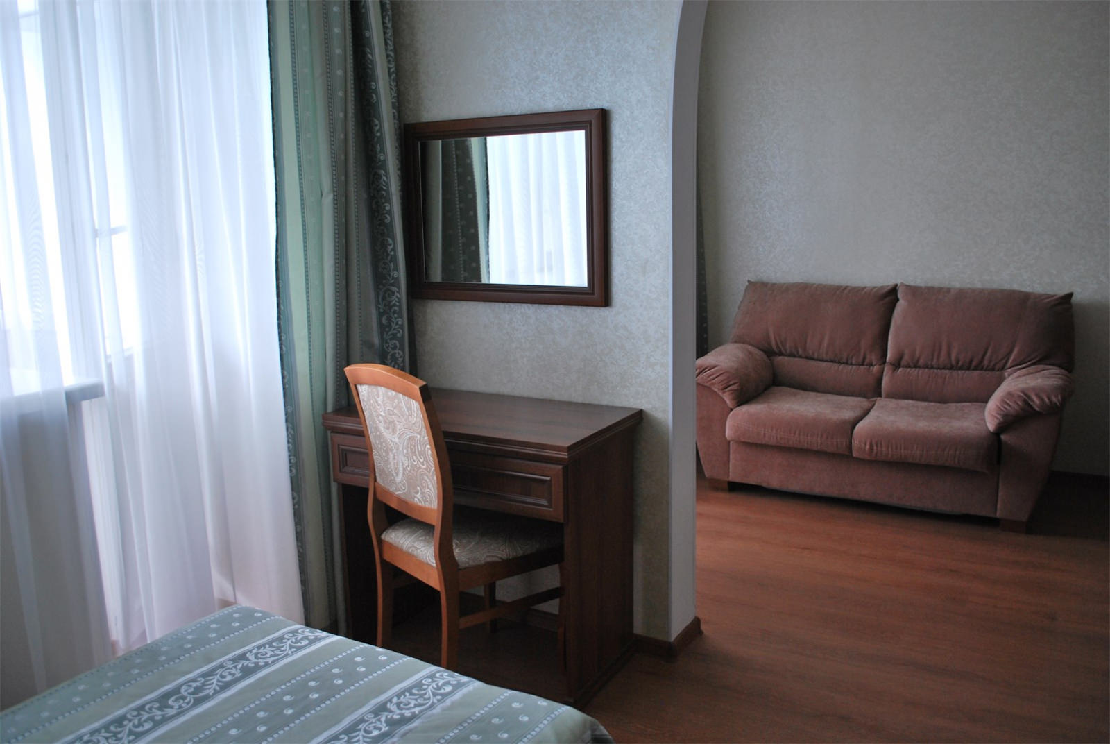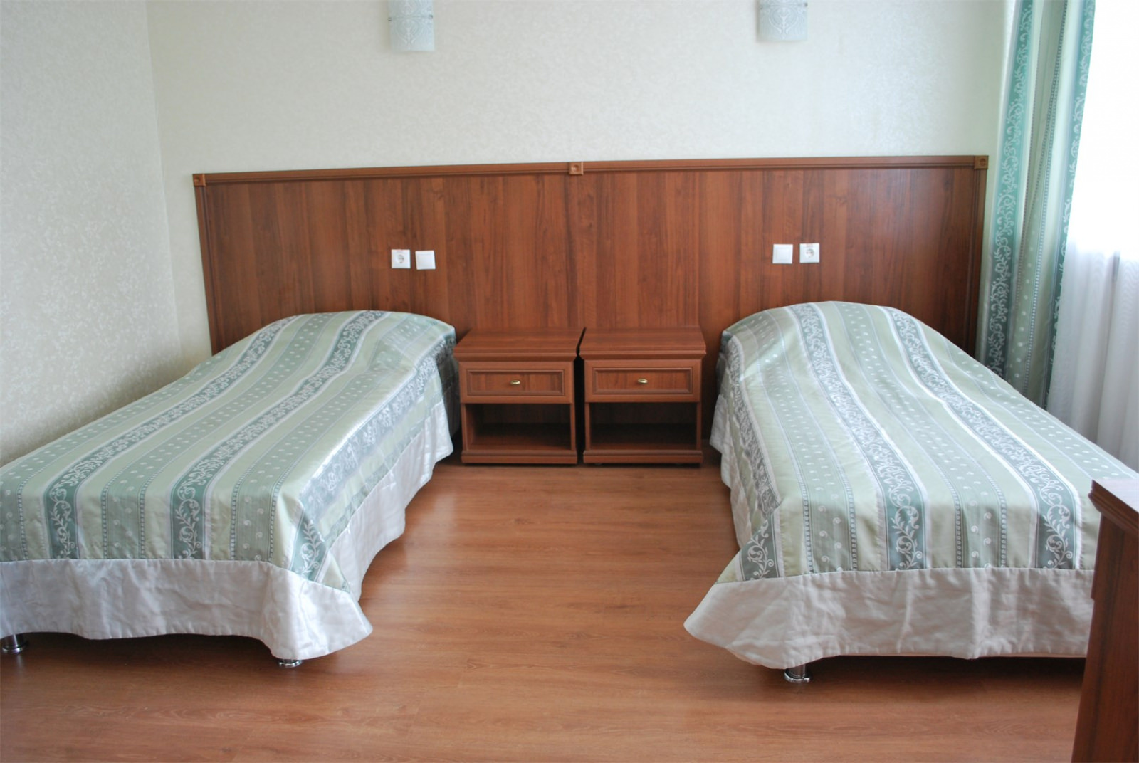 Площадь номера - 27 кв.м. 2 осн. места. 1 доп. место. Мебель: вешалка, диван, зеркало, кровати односпальные, прикроватные тумбочки, столик журнальный, столик туалетный, стулья, тумба под телевизор, шкаф-купе. Оборудование: набор посуды, сейф, телевизор, холодильник. Санузел: с душем, туалетные принадлежности, фен. Сервис: Wi-Fi бесплатно, смена полотенец, смена постельного белья, уборка номера.